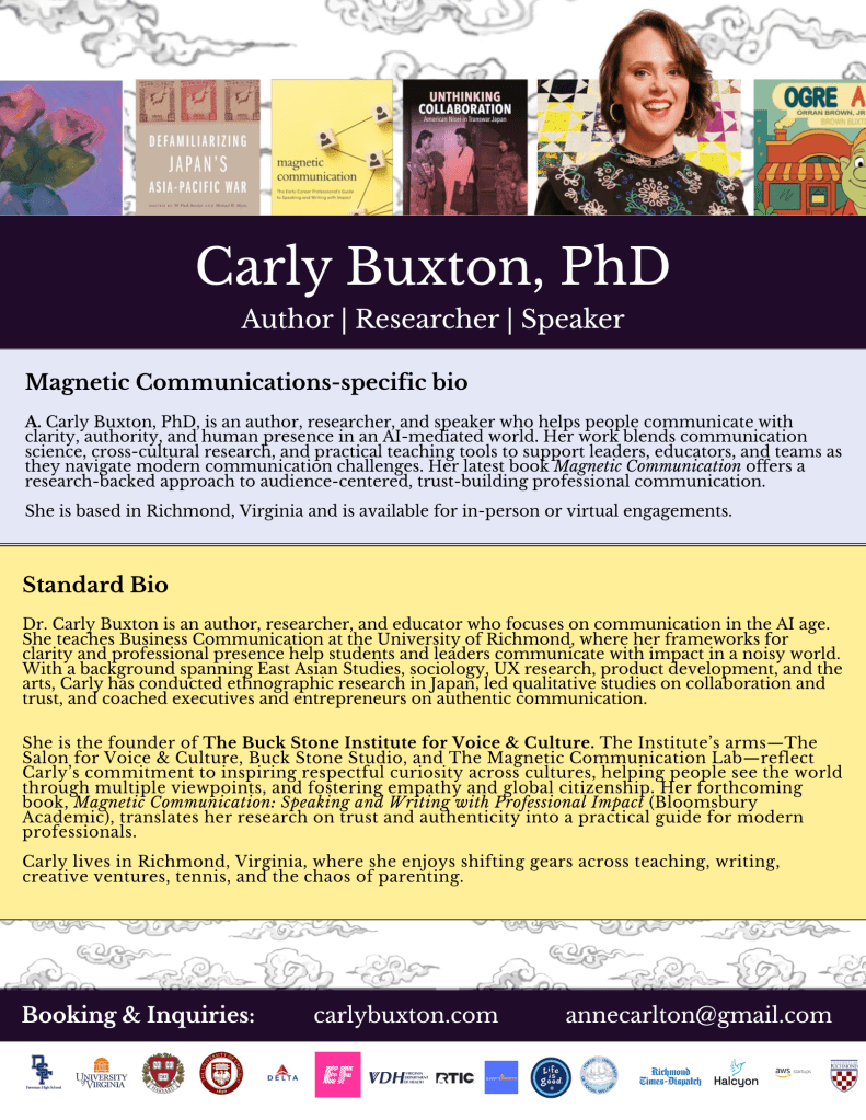 I study how trust is formed, how audiences interpret signals online and in-person, and how people express judgment and voice across digital and AI-mediated contexts. My forthcoming book, Magnetic Communication, offers a research-backed approach to speaking and writing with professional impact.